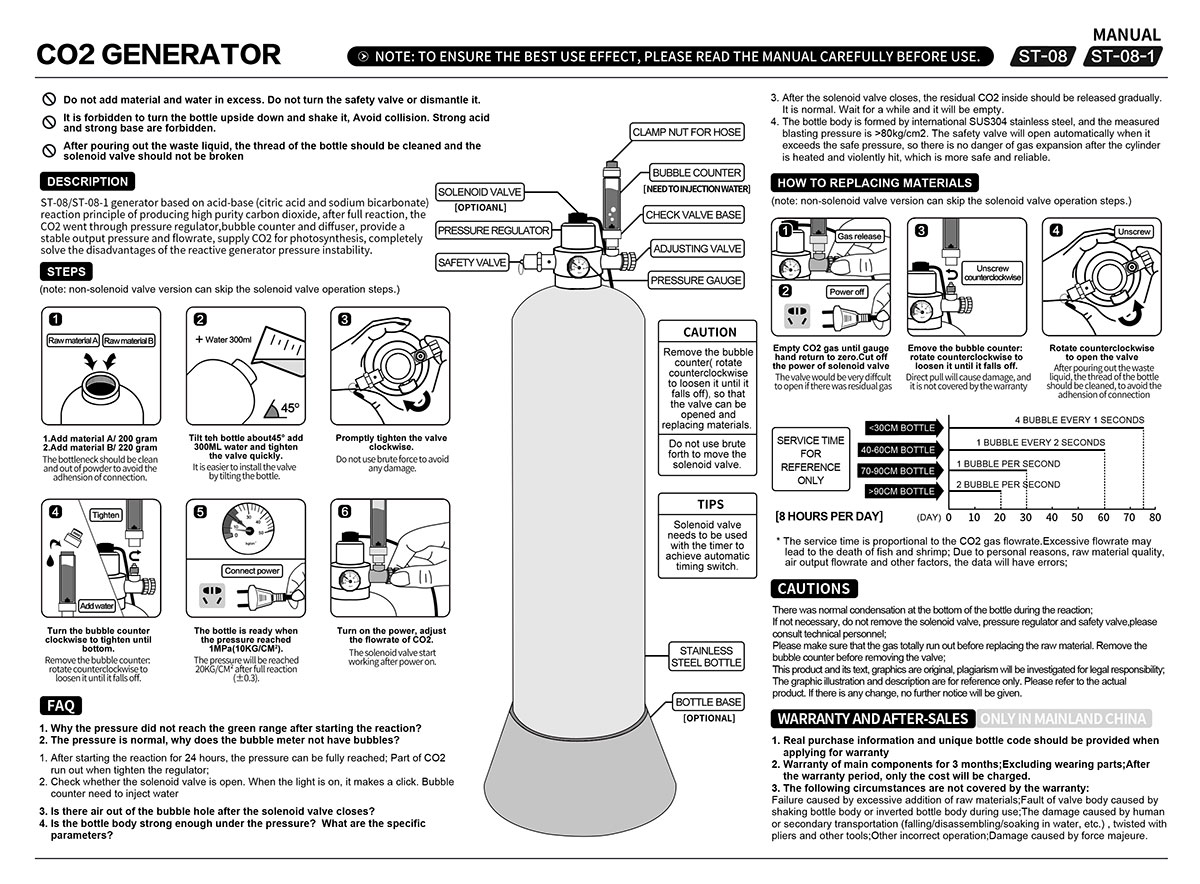ST-08-1 aquarium CO2 generans utitur principio reactionis acidi-basi, acidum citricum cum sodium bicarbonate regente ad puritatem altam CO2. Per formulam scientificam et processum reactionem efficacem, machinam constanter CO2 emittit, continuam copiam gasi aquarium plantarum praebens, eorum photosynthesin occurrens indiget ac sanum incrementum promovens. Cum generantibus reactionem translaticiis comparatur, lineamenta ST-08-1 emendavit pressionis temperantiae. Instructus pressionis ordinator devotae, bullae contra, et diffundens, stabilis output pressionem et uniformem bullae dispersionem tradit, incommodum pressionis fluctuationes eliminans.